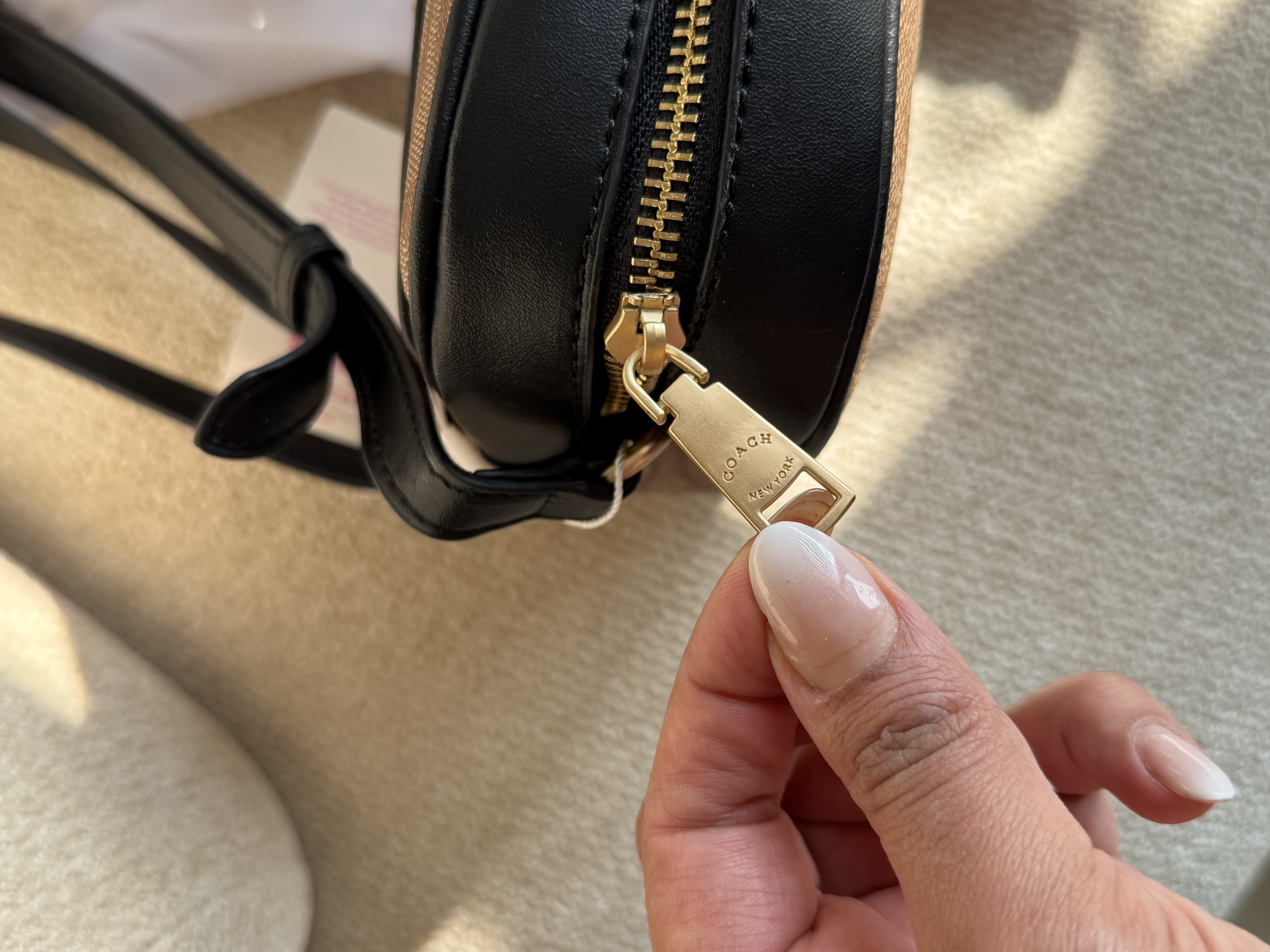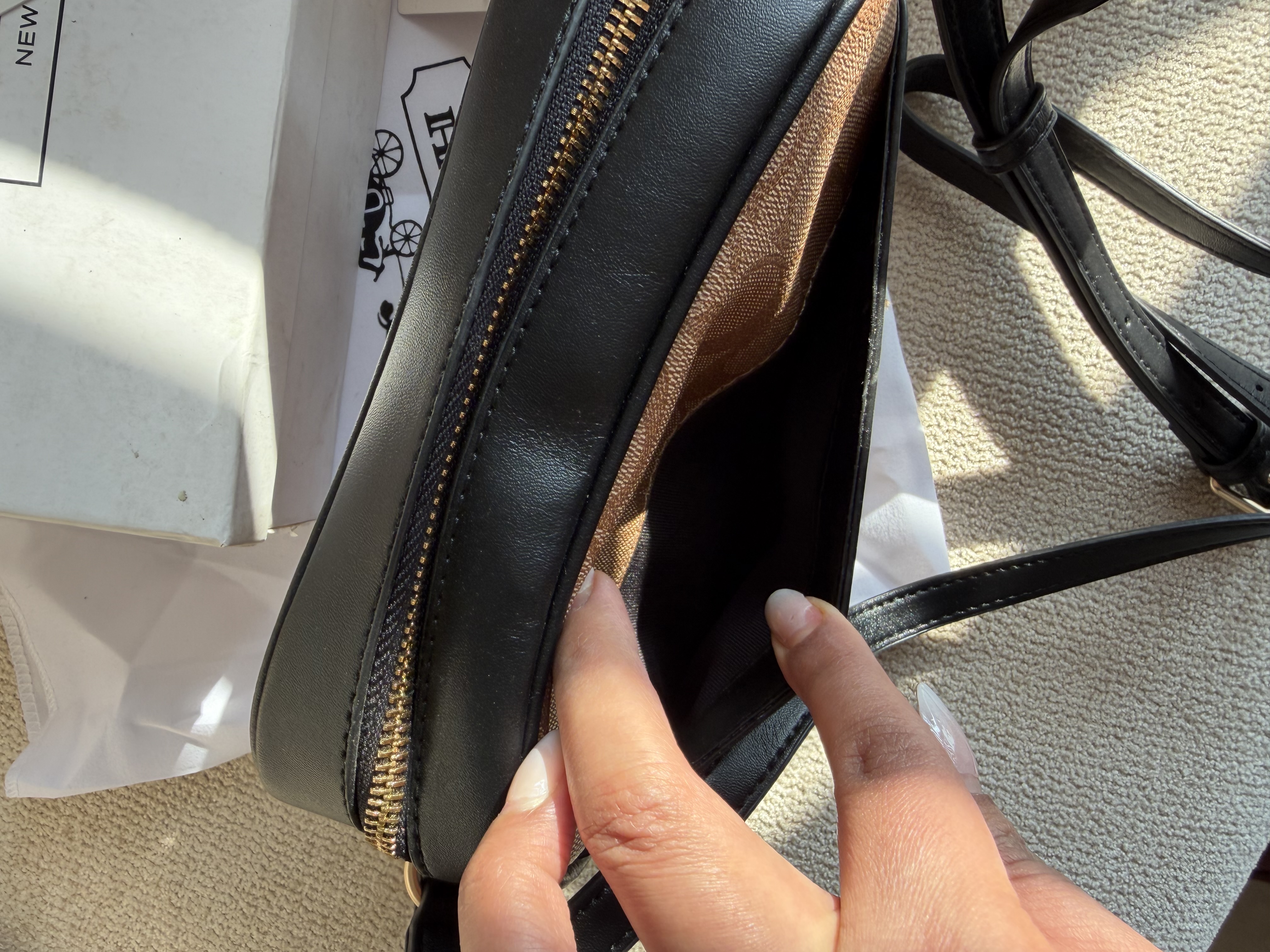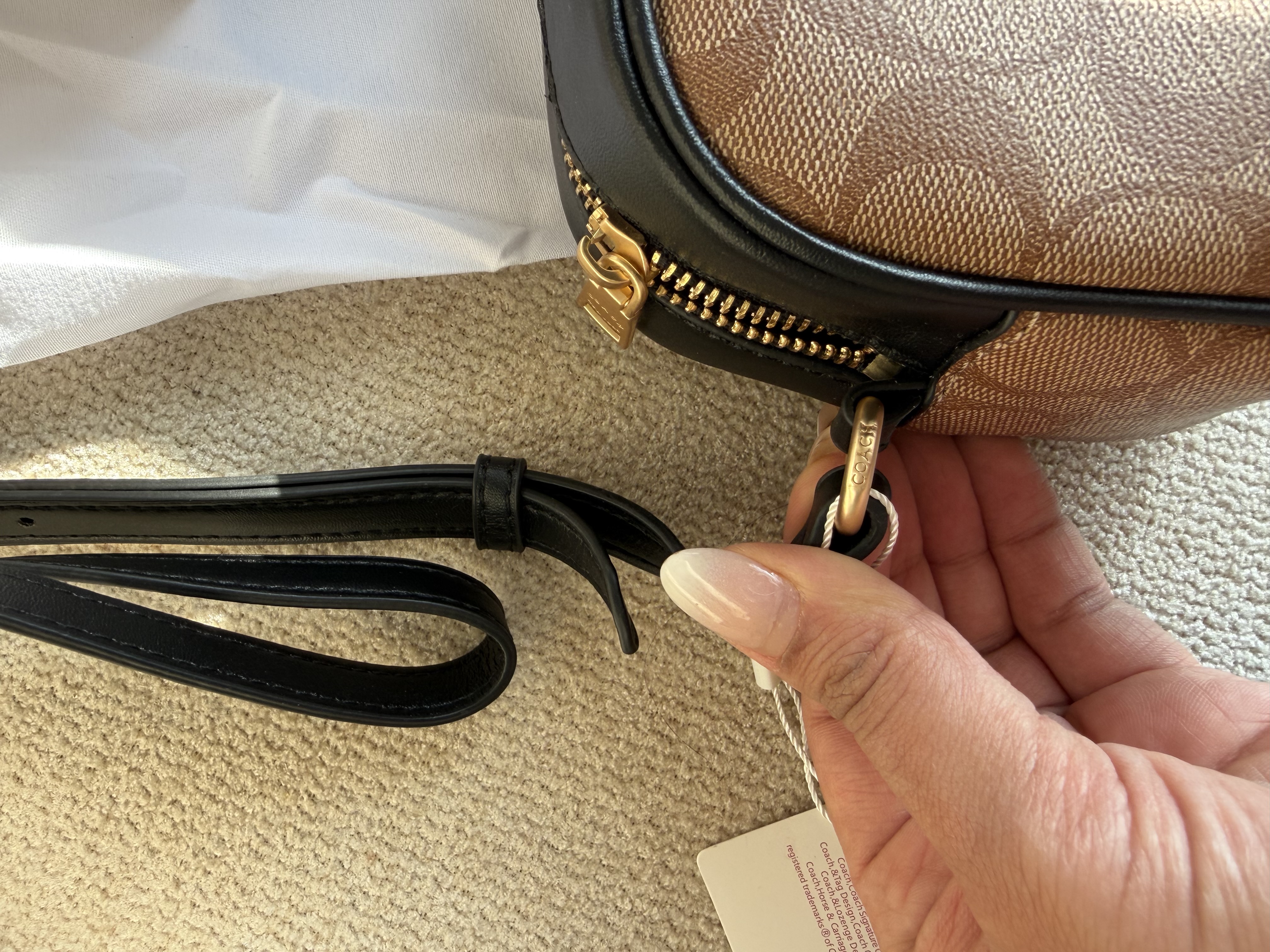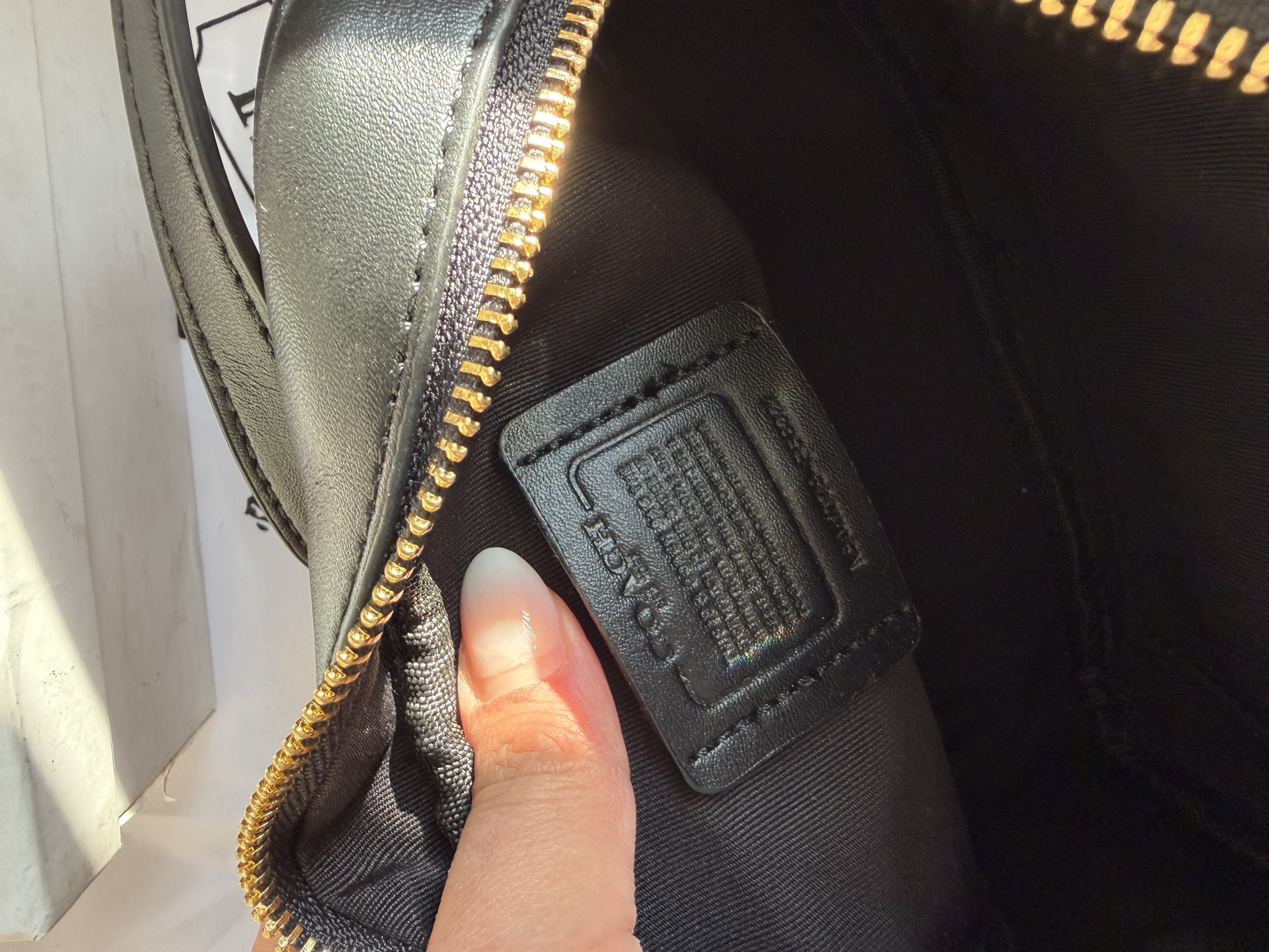 روی یراق ها و سر زیپ ها و داخل آستر کیف برند کوچ حک شده