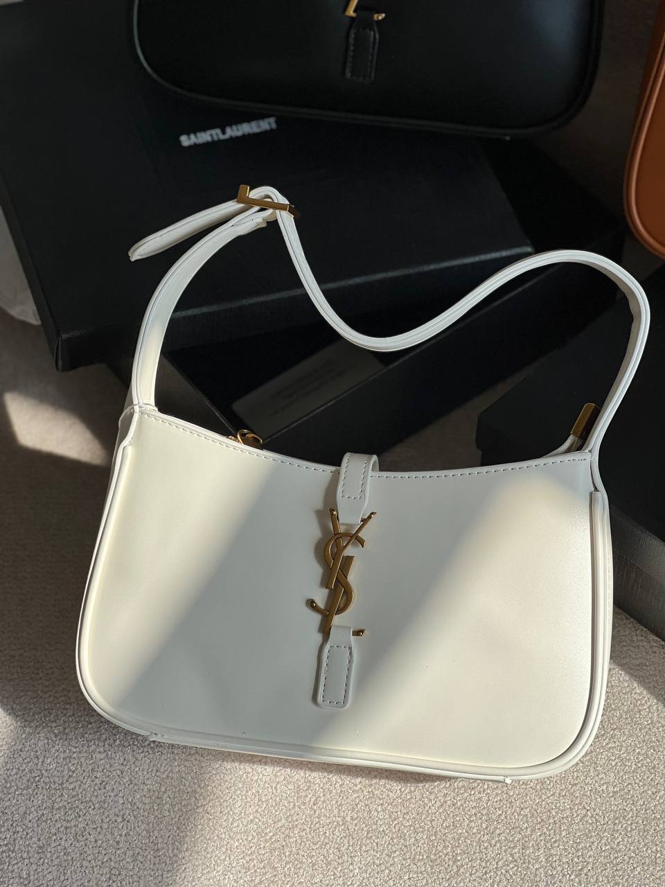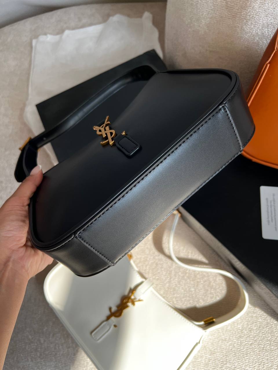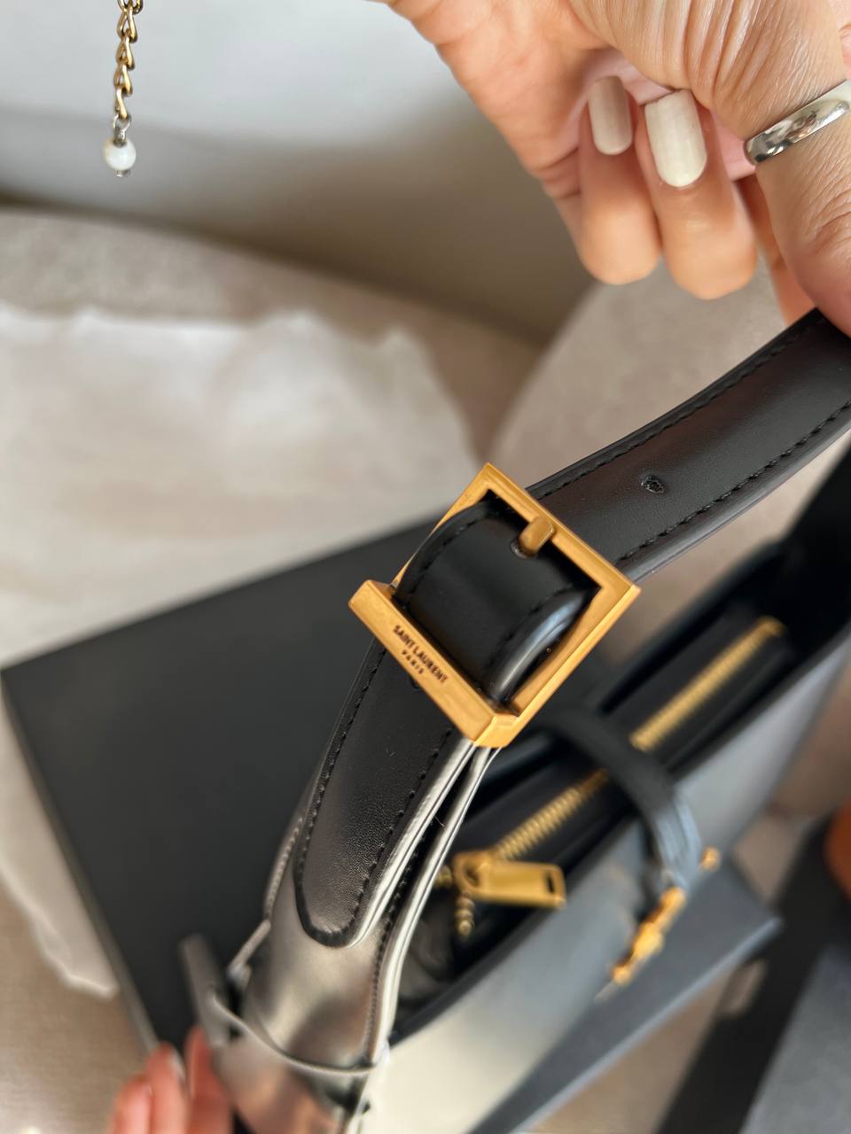 برند YSL روی یراق کیف بهصورت حک شده و همچنین استر داخلی کیف نیز با برند مشخص شده است که اصالت و ظرافت آن را دوچندان میکند. بند کوتاه کیف قابلیت تنظیم داشته و بهراحتی روی شانه قرار میگیرد.
