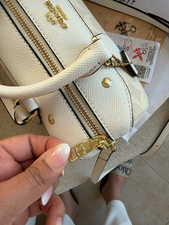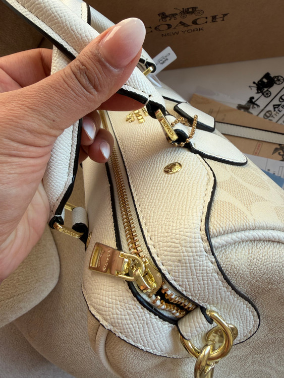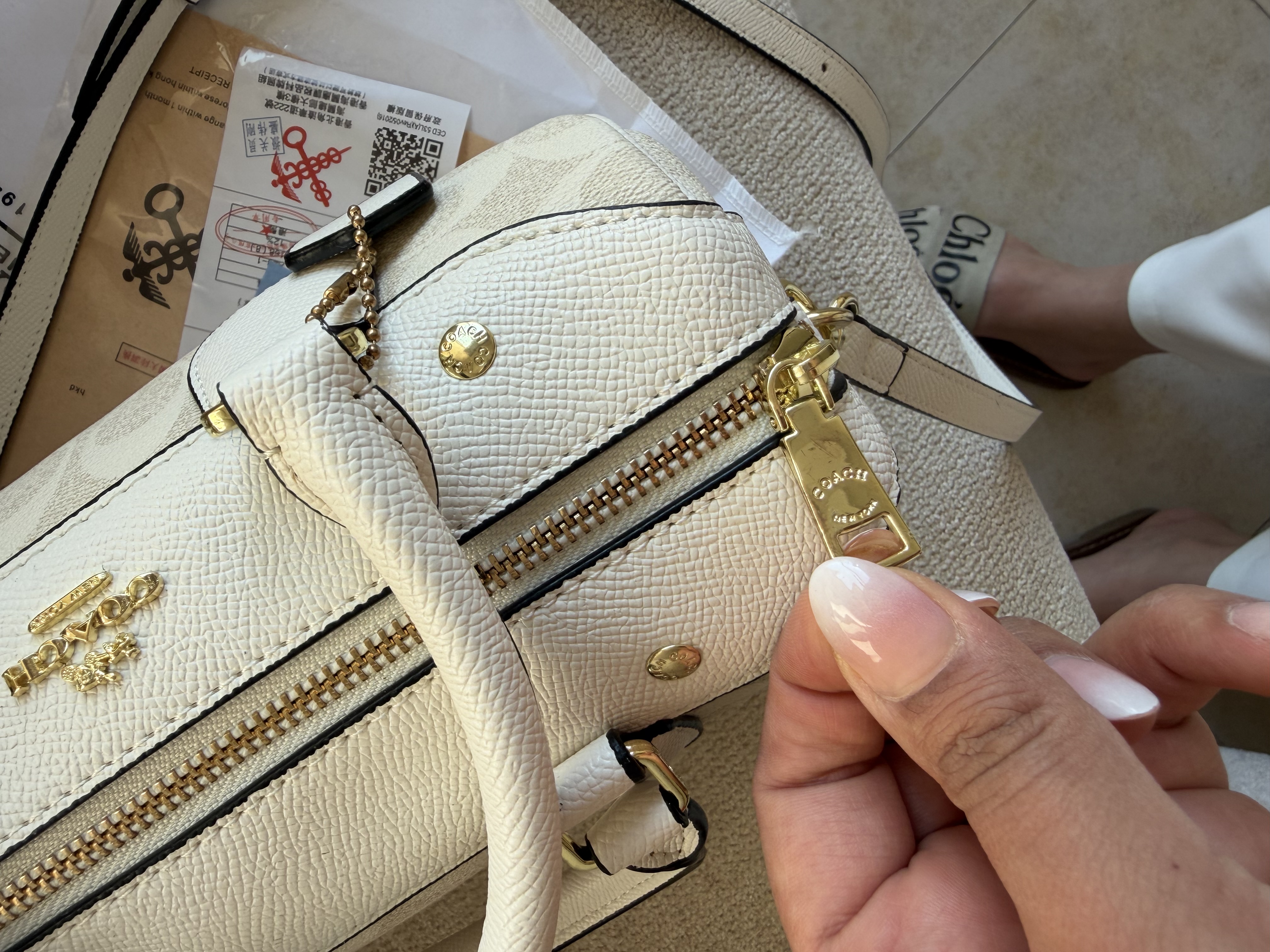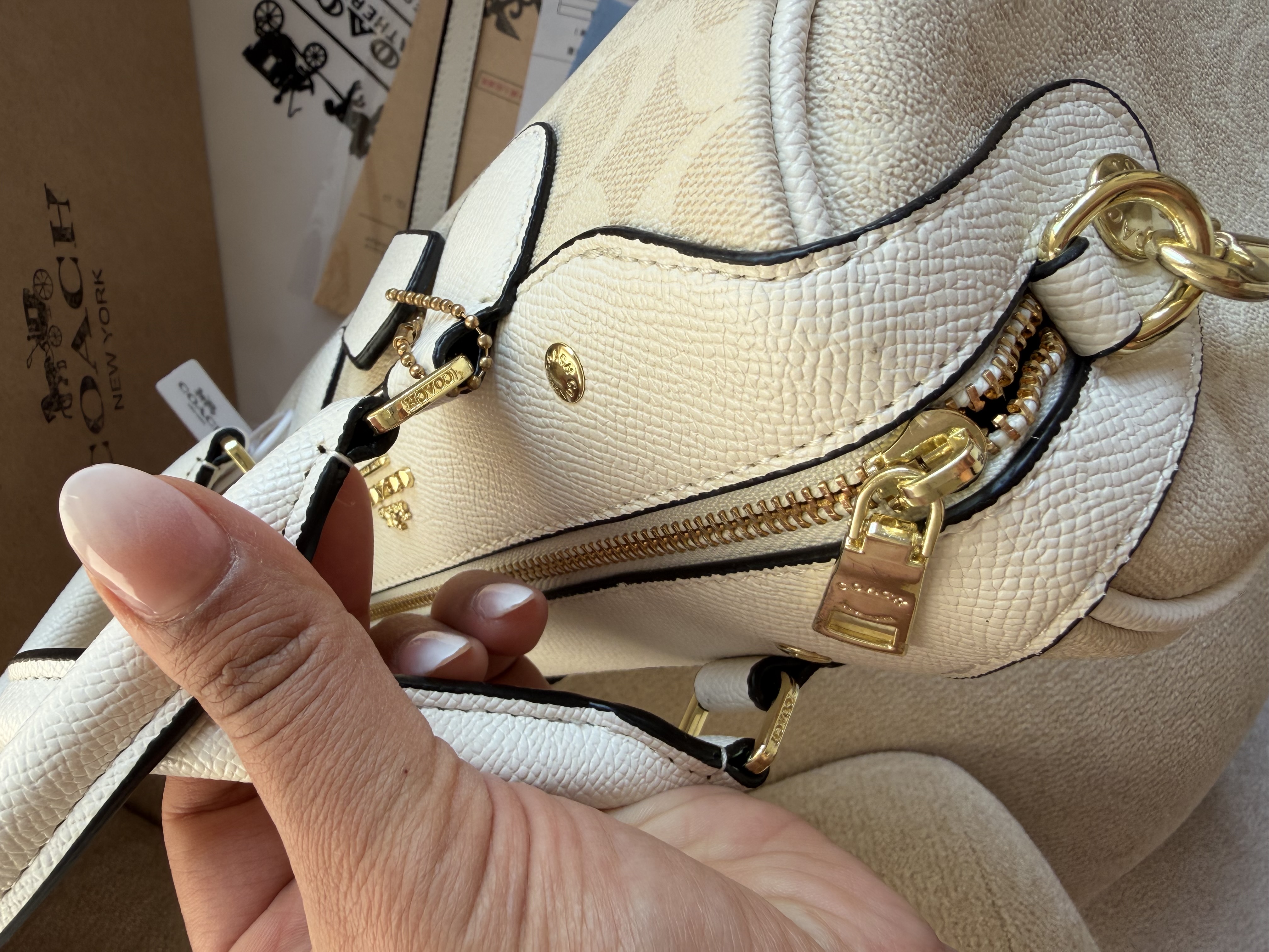 روی یراق ها و زیپ و آستر کیف برند کوچ حک شده