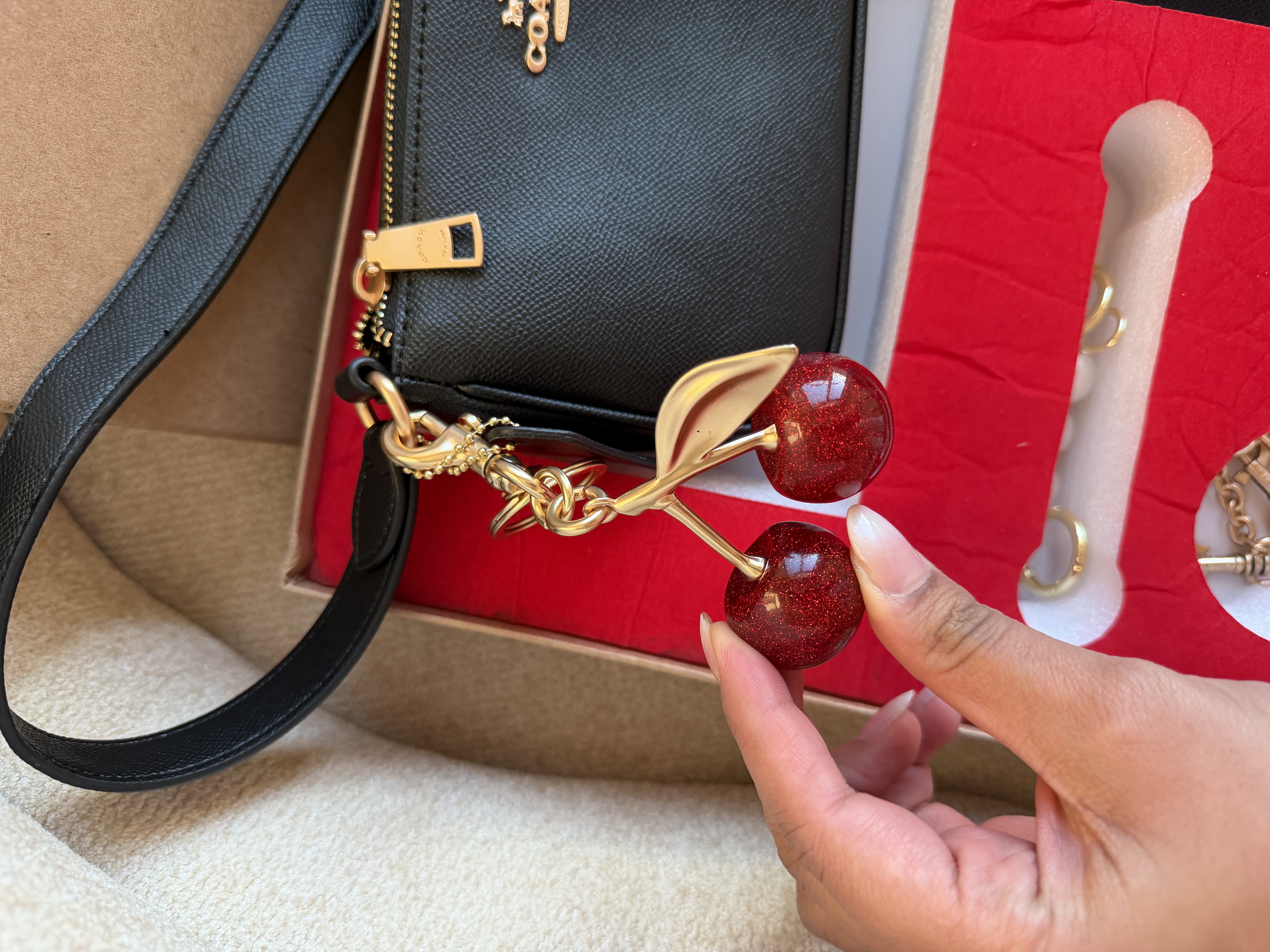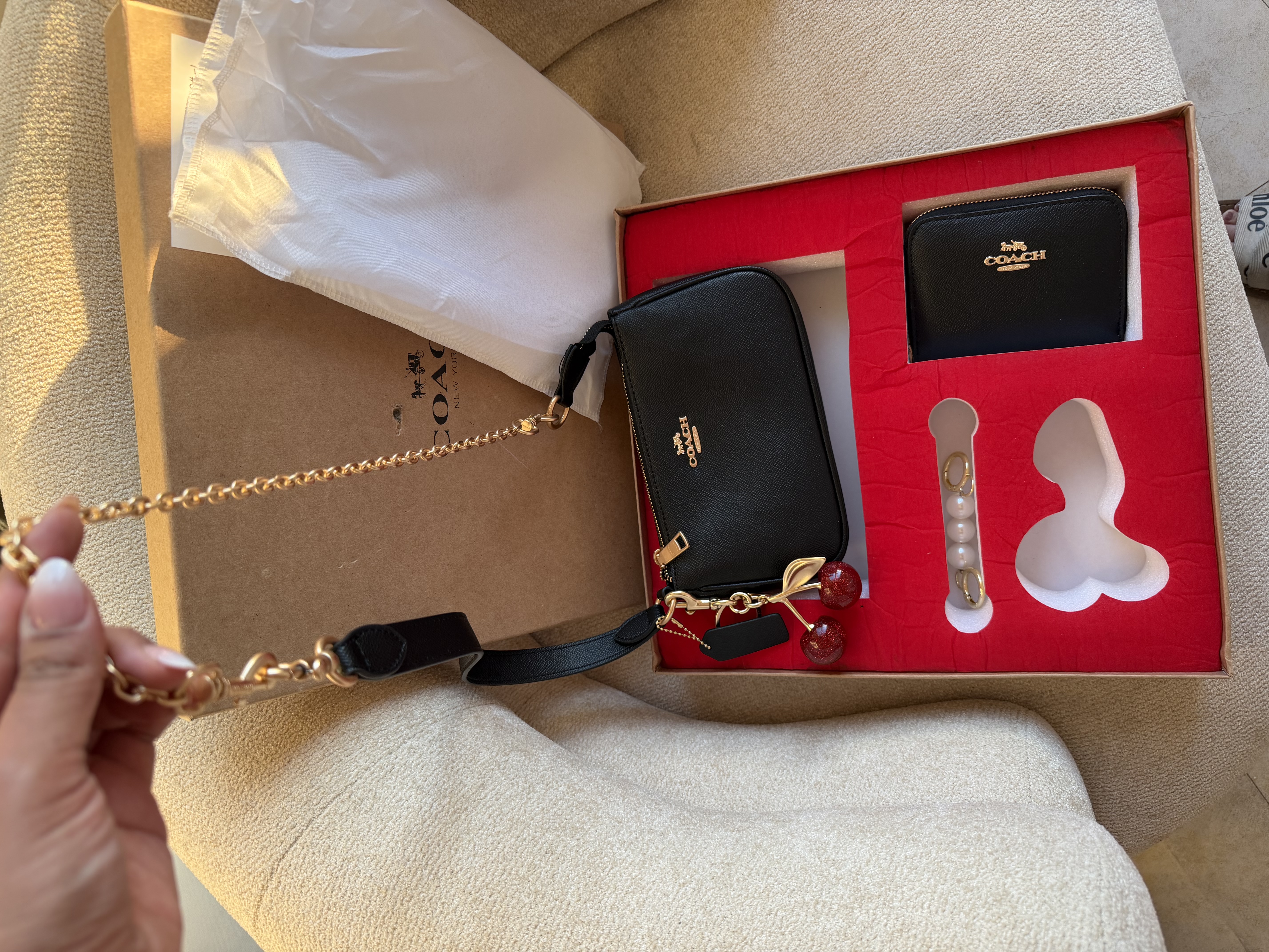 این پک شامل کیف اصلی + جا کارتی + اویز گیلاسی + زنجیر + آویز مرواریدی