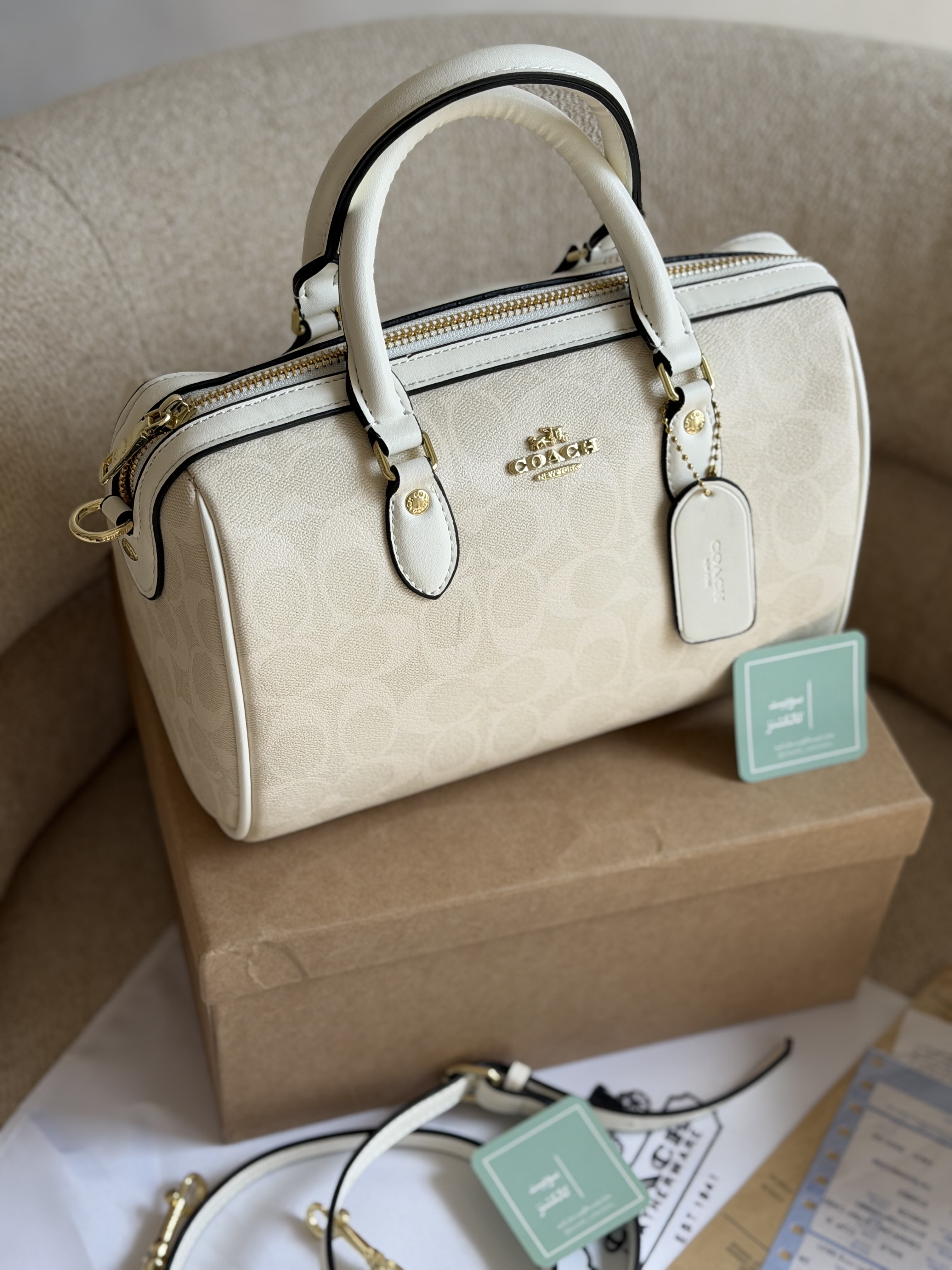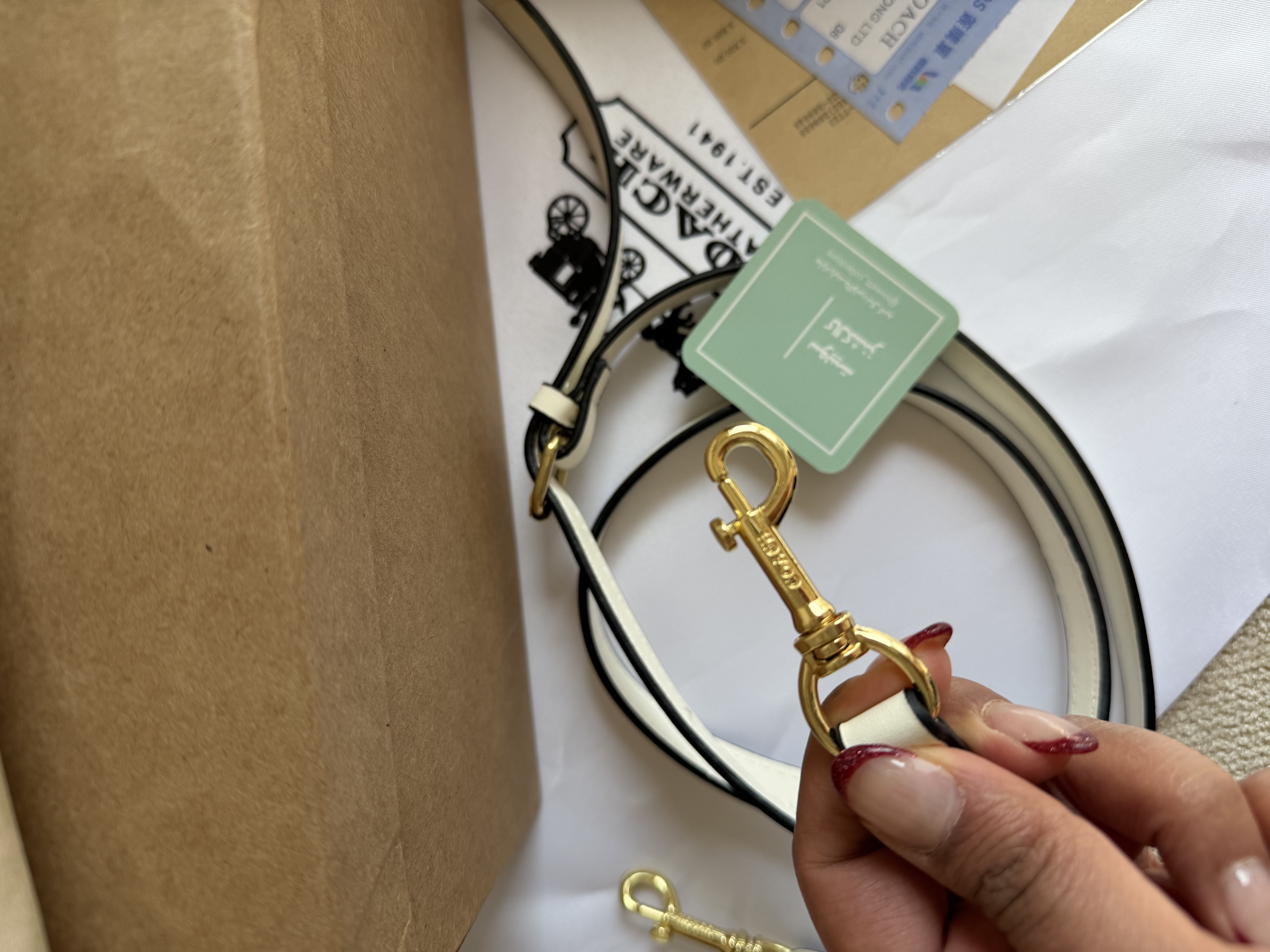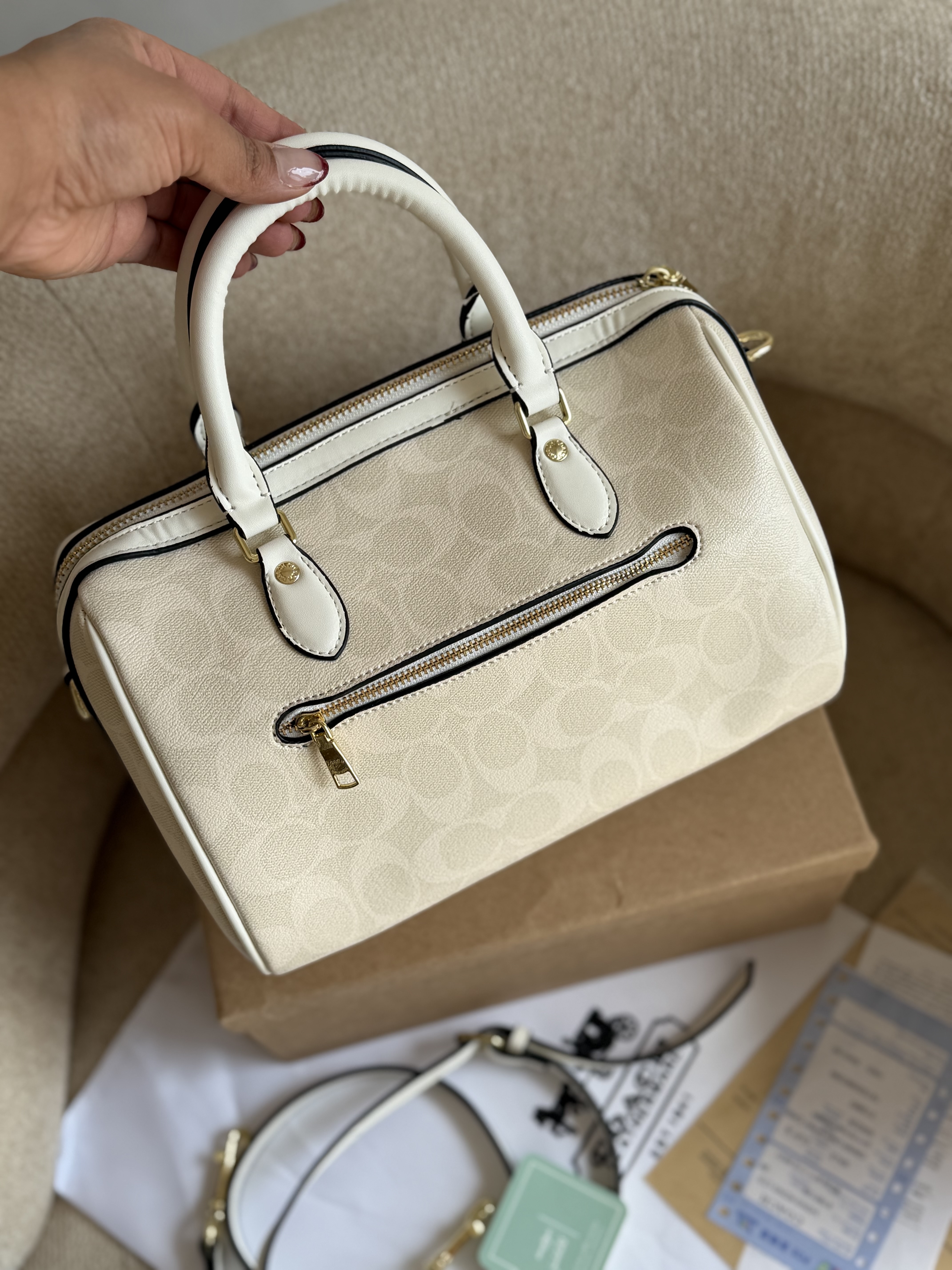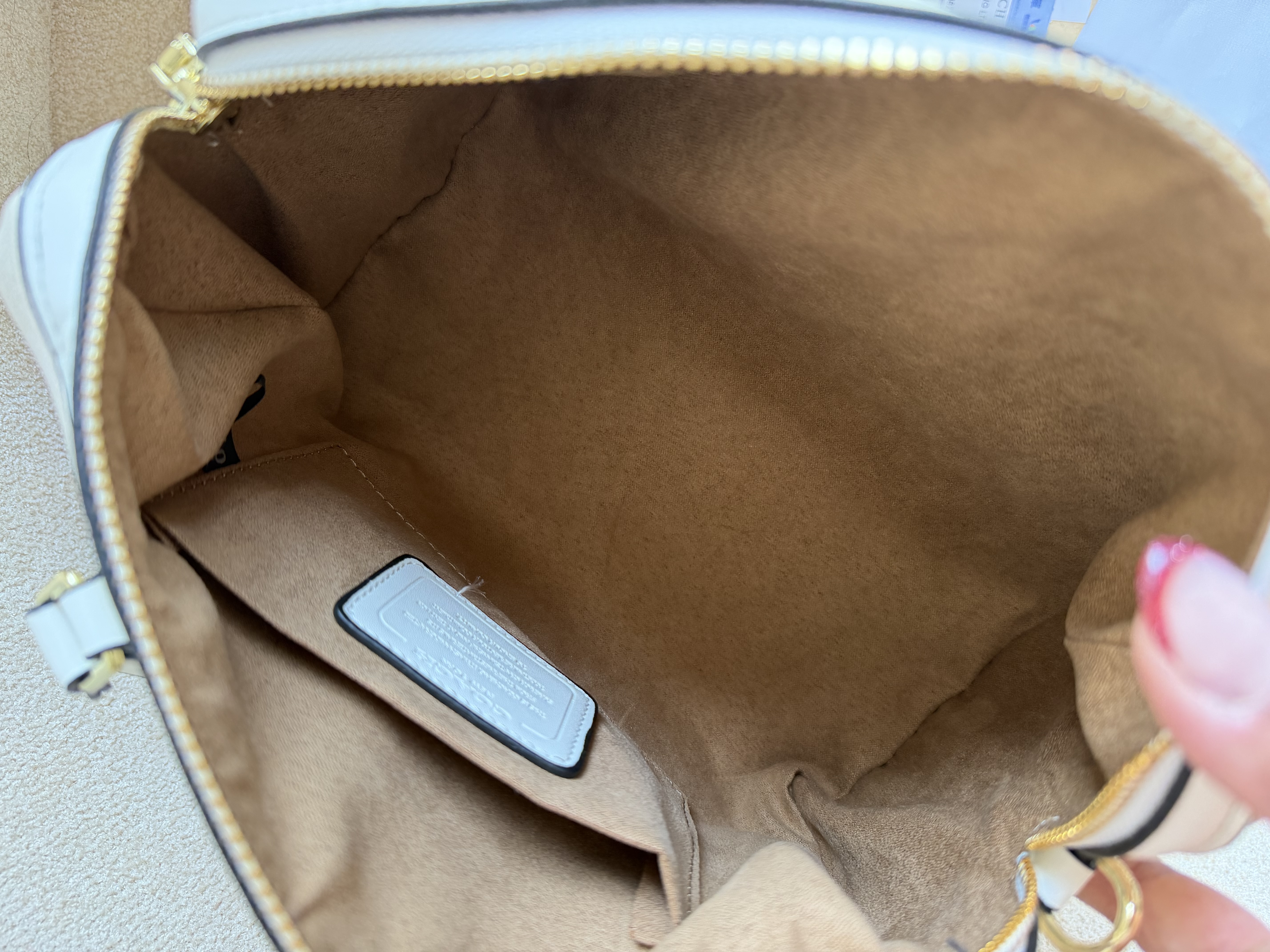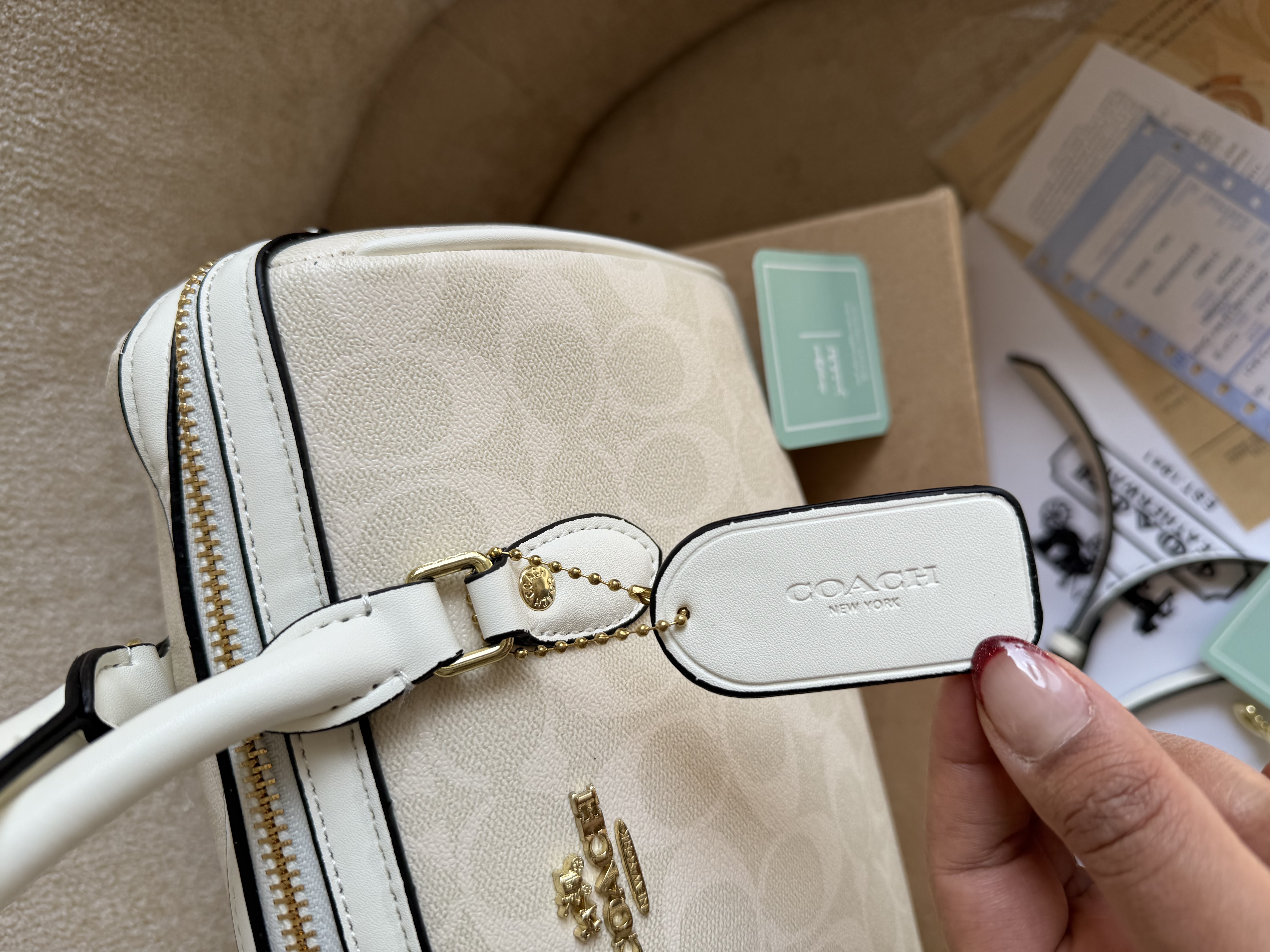 روی یراق ها و زیپ و آستر کیف برند کوچ حک شده