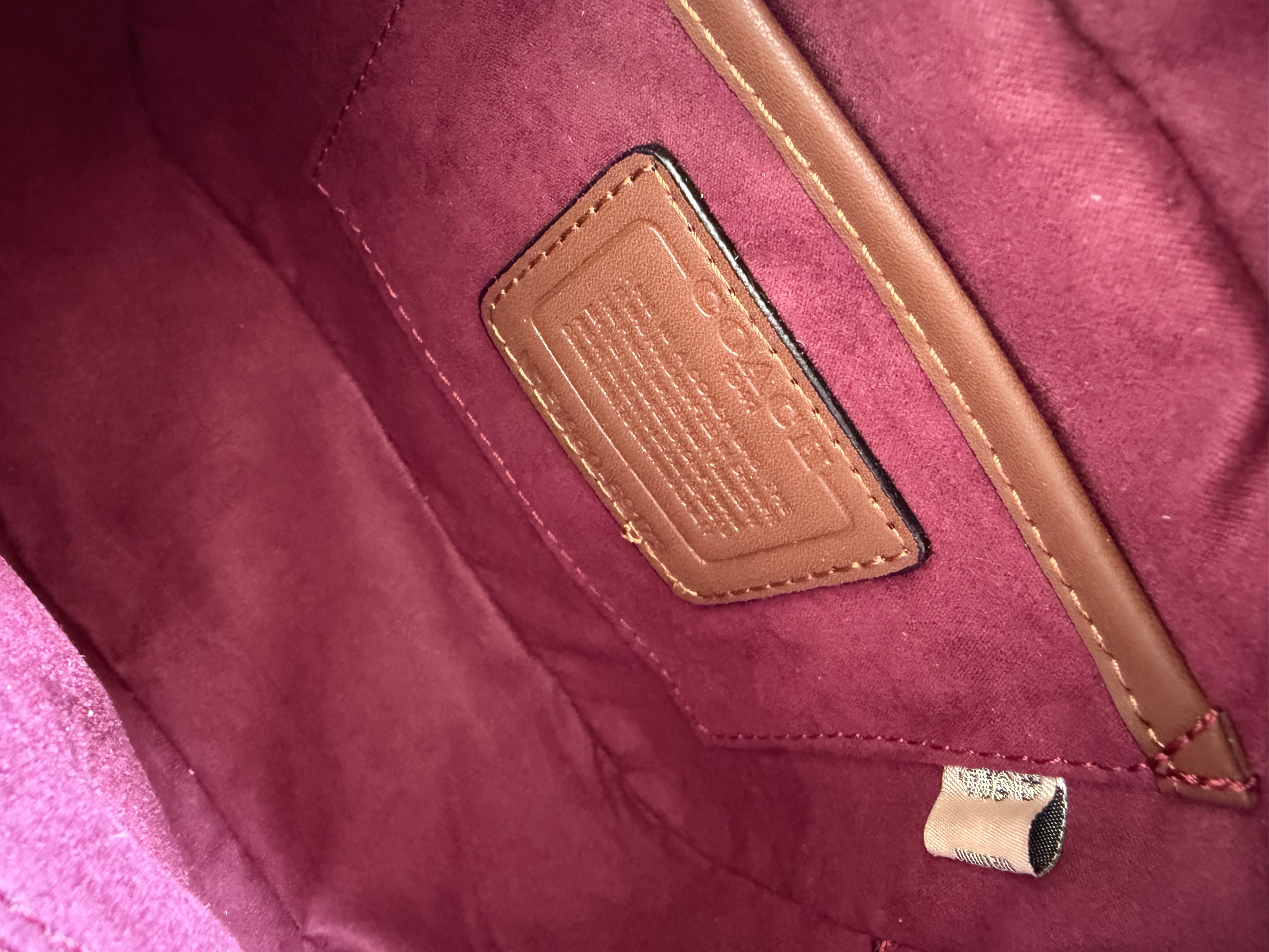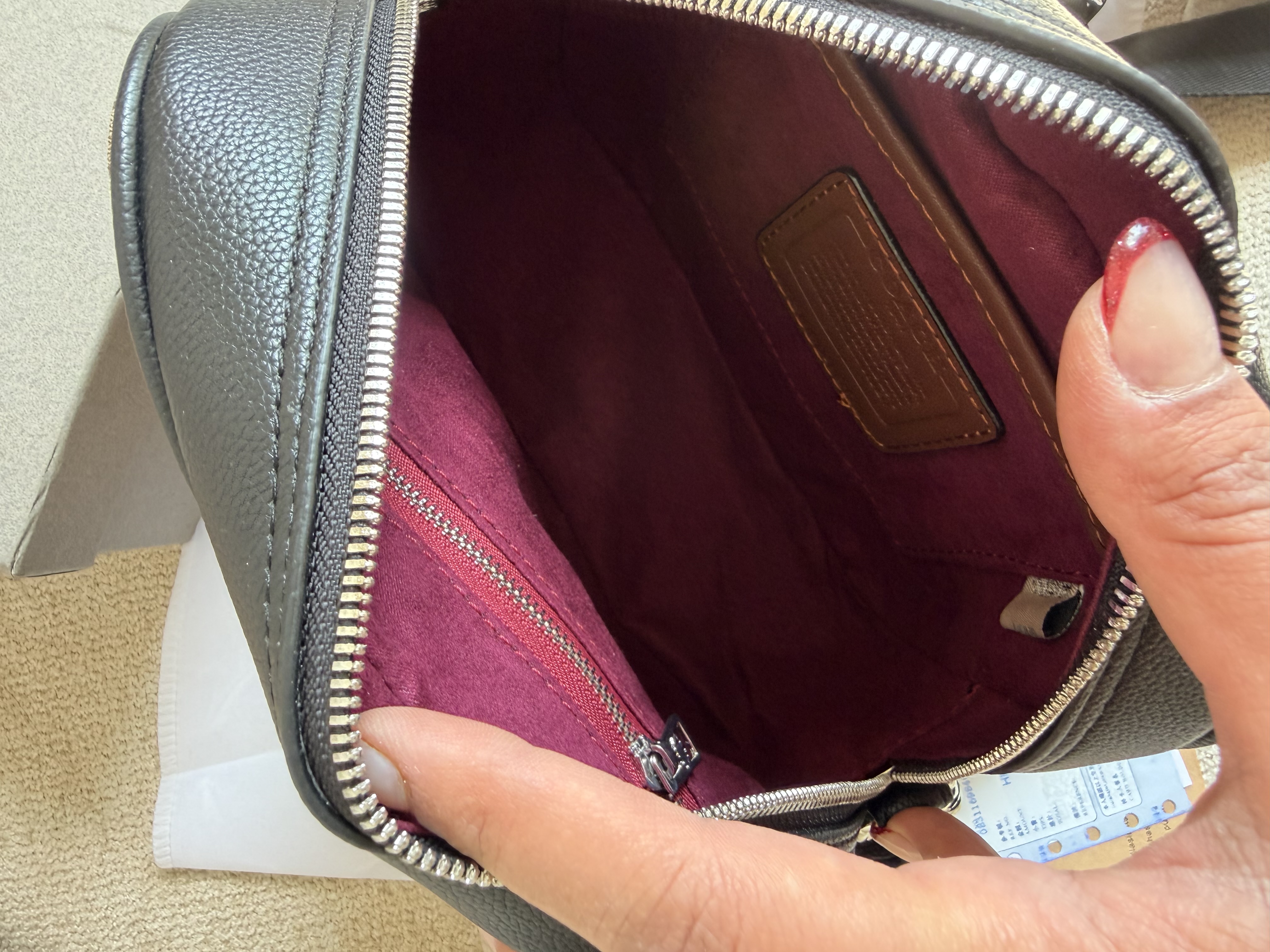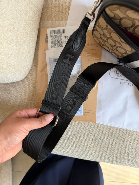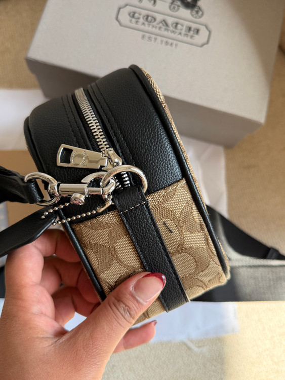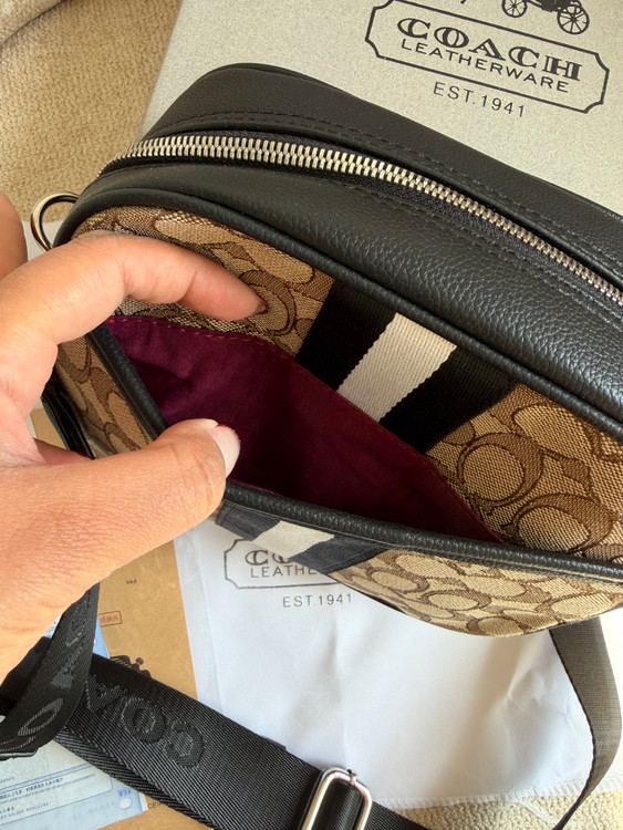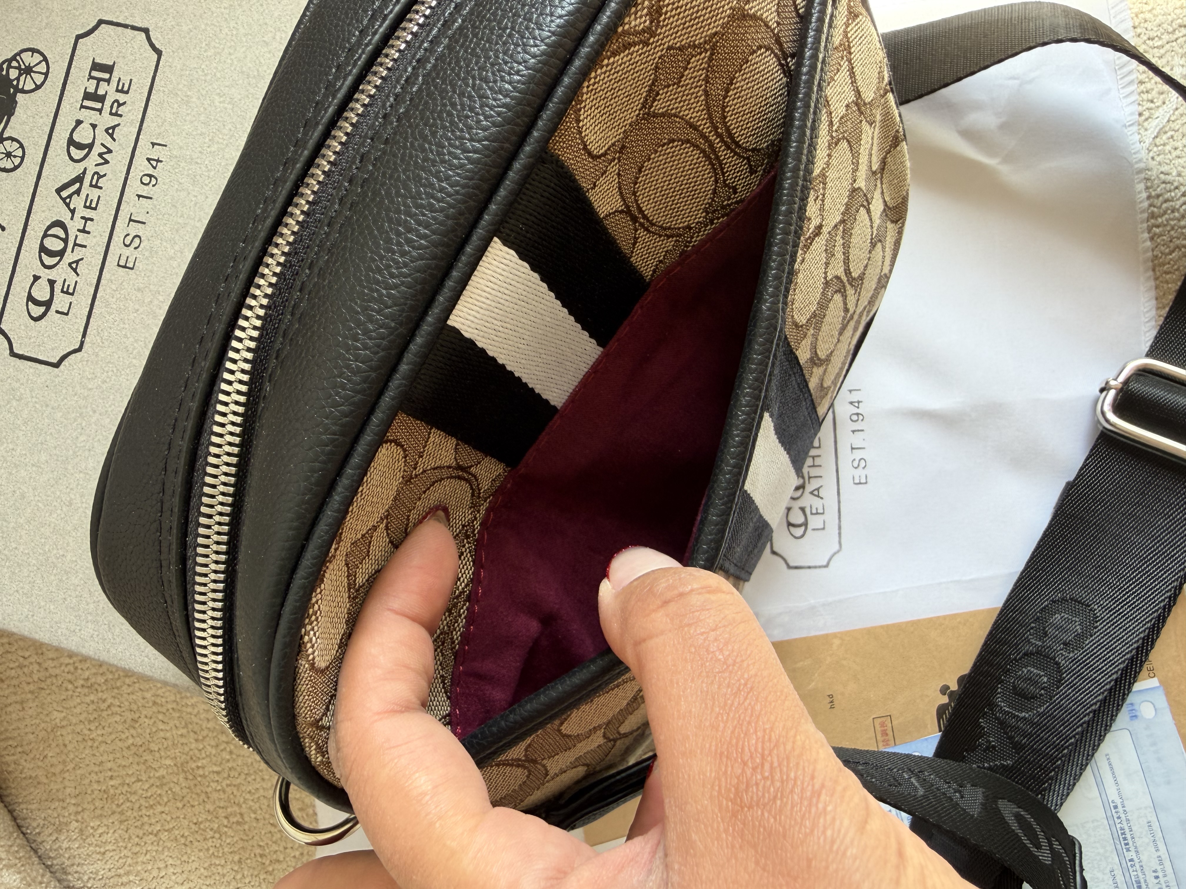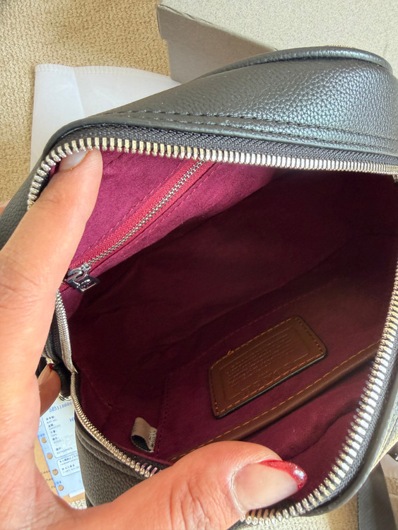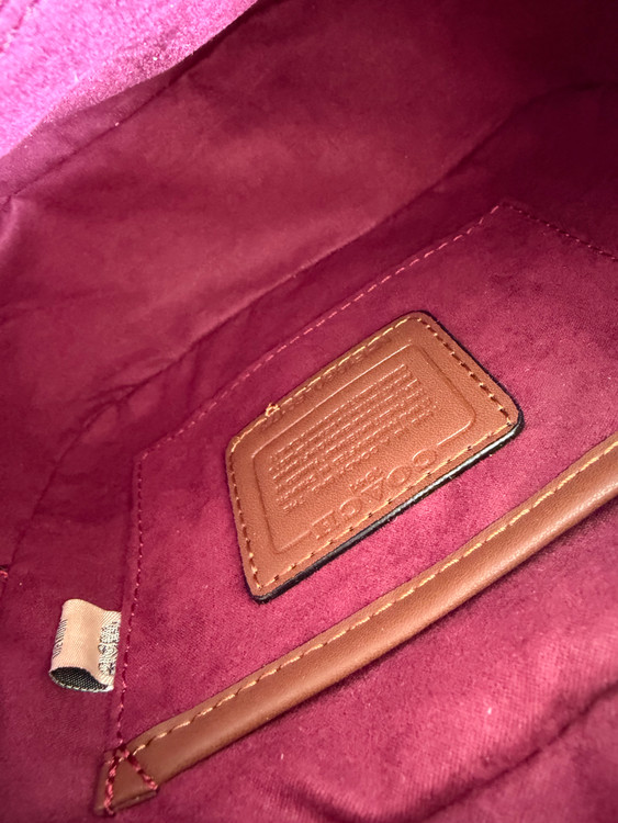 روی یراق ها و زیپ و آستر کیف برند کوچ حک شده