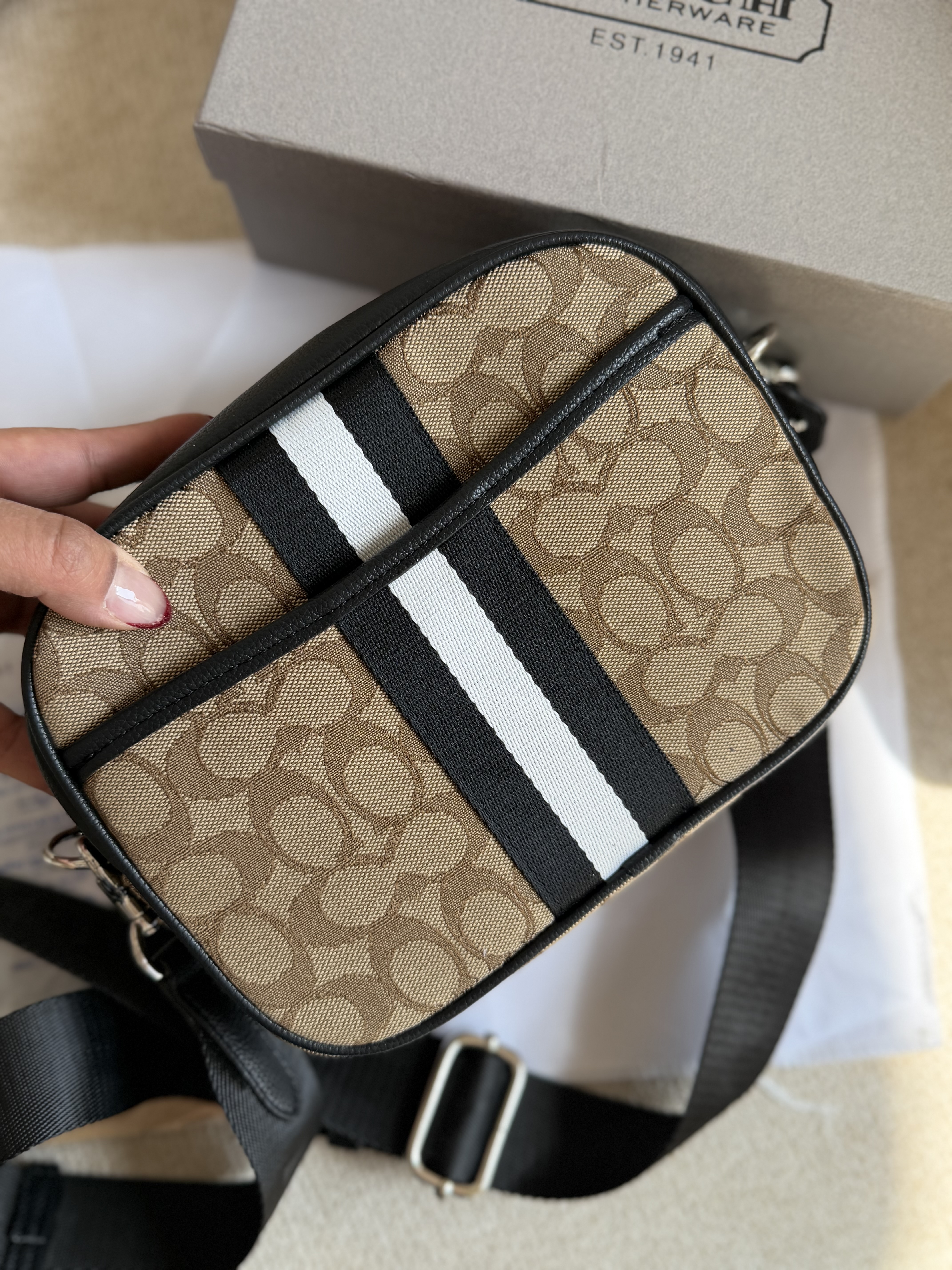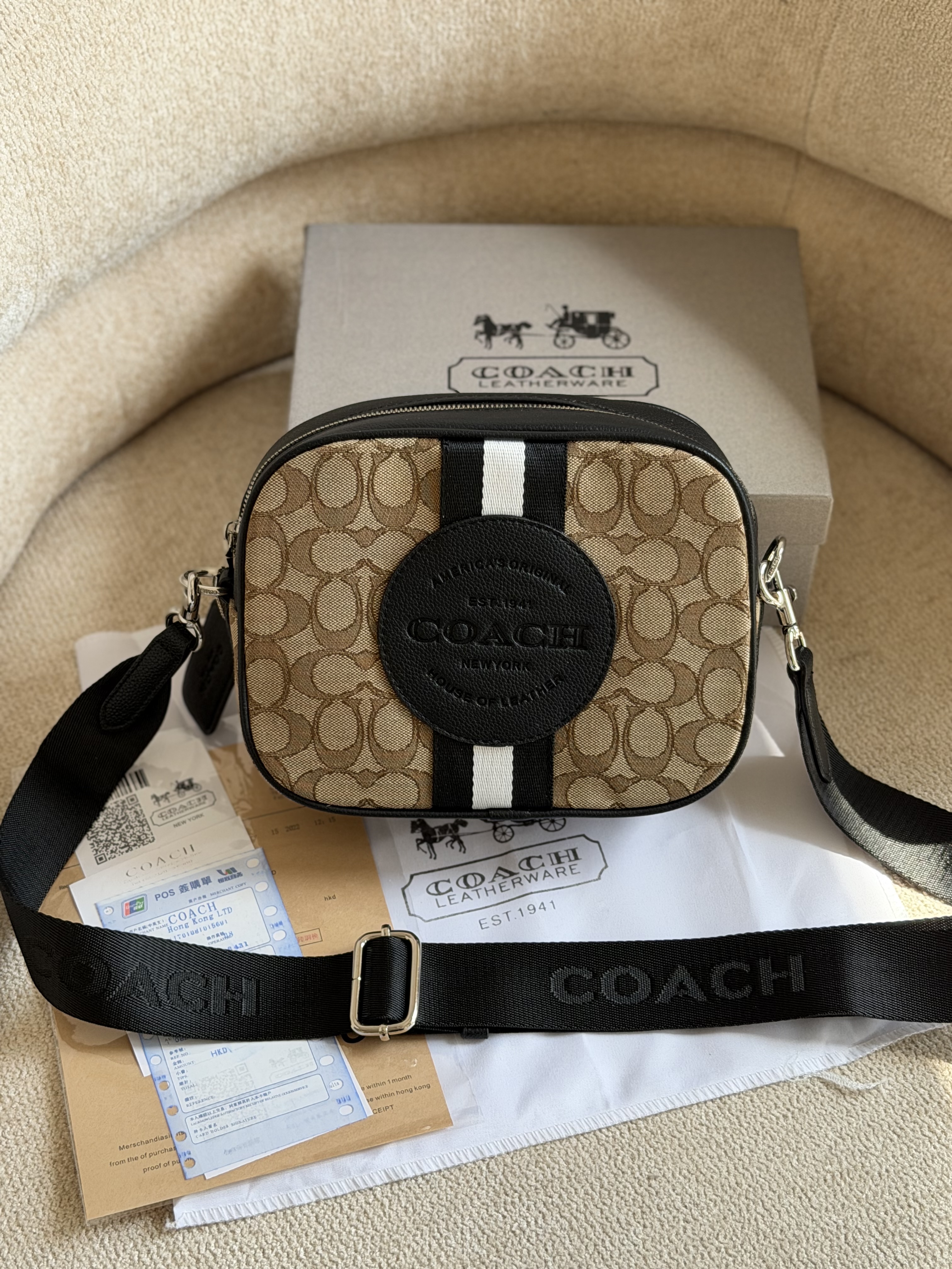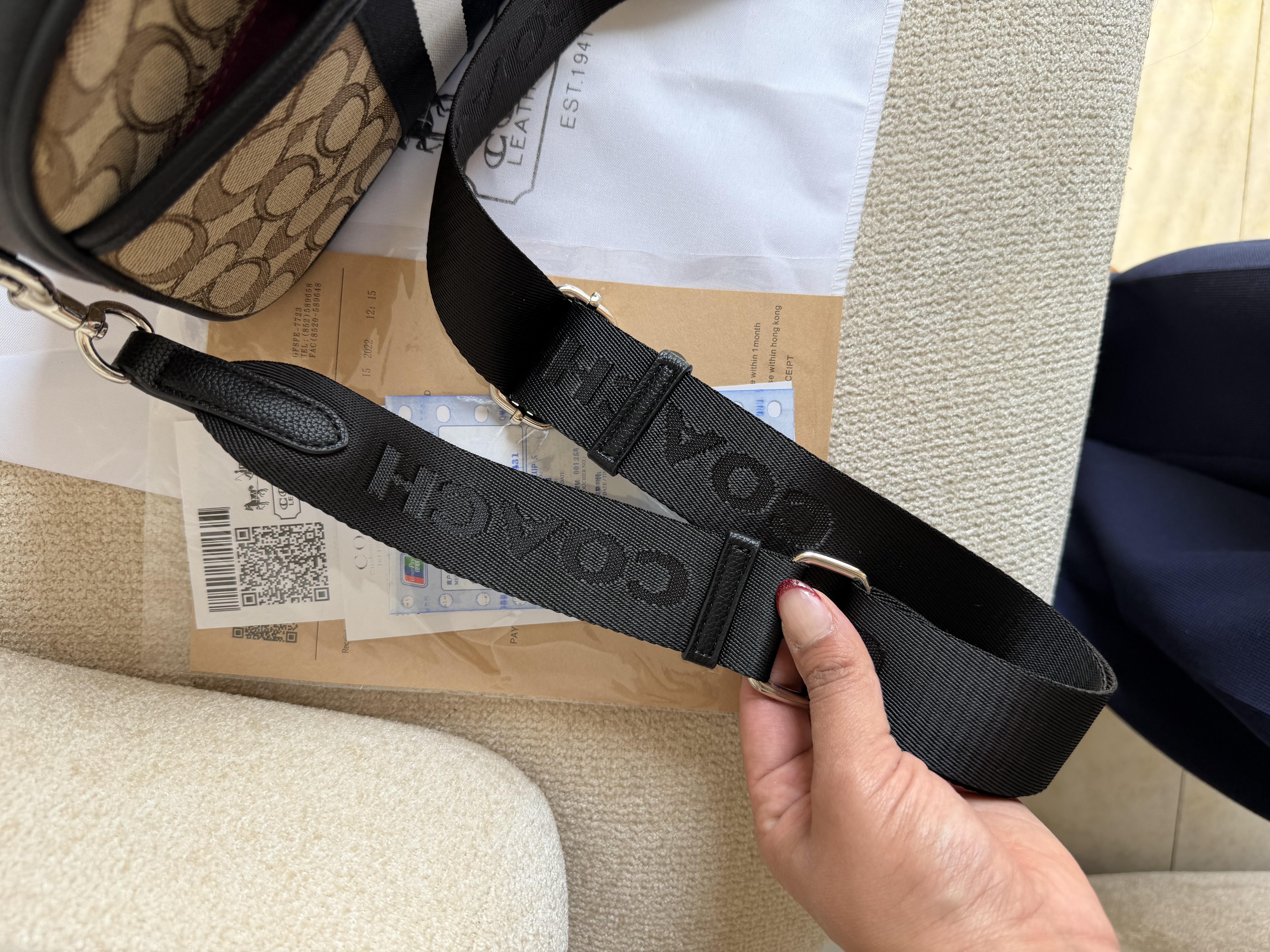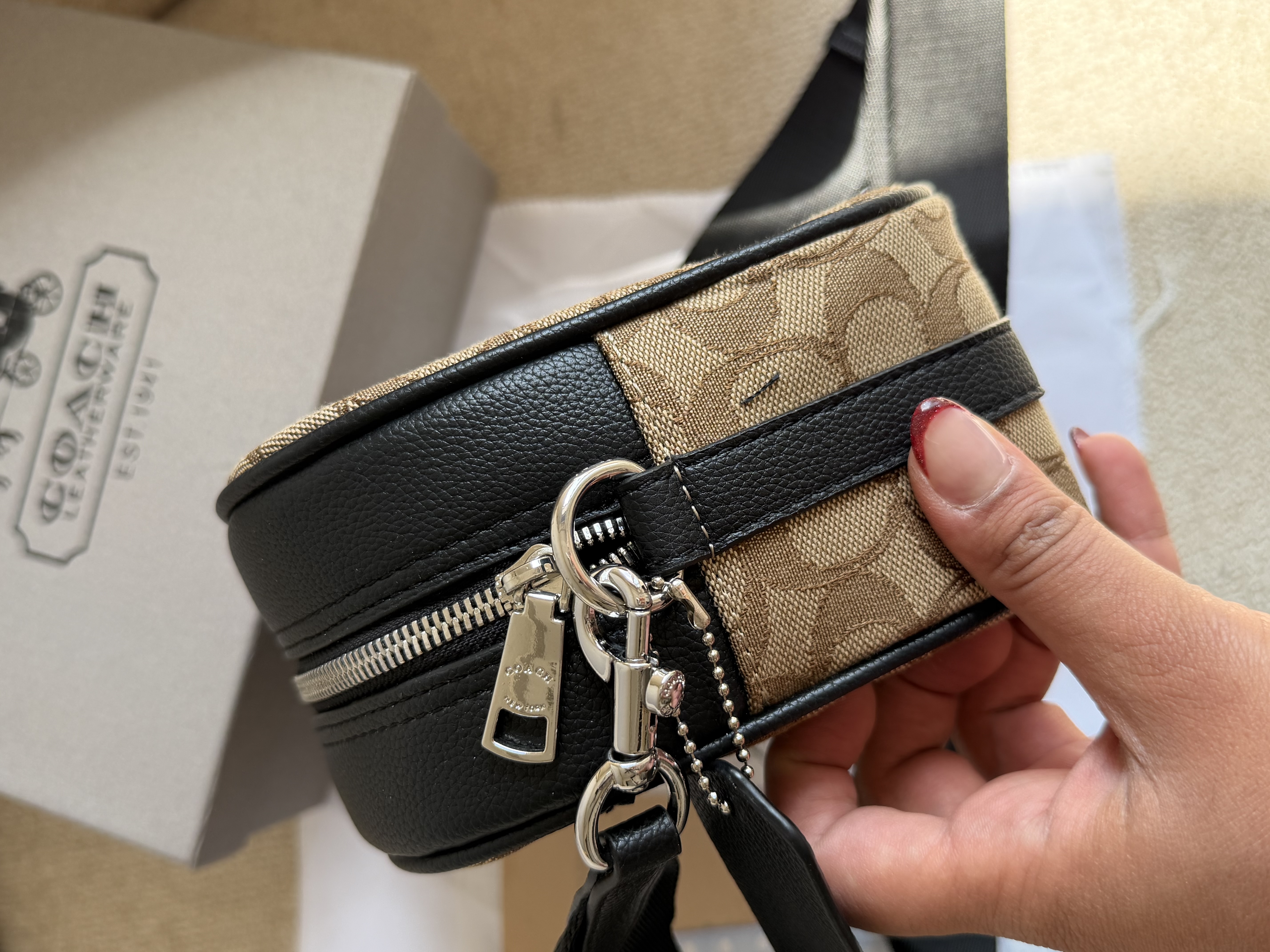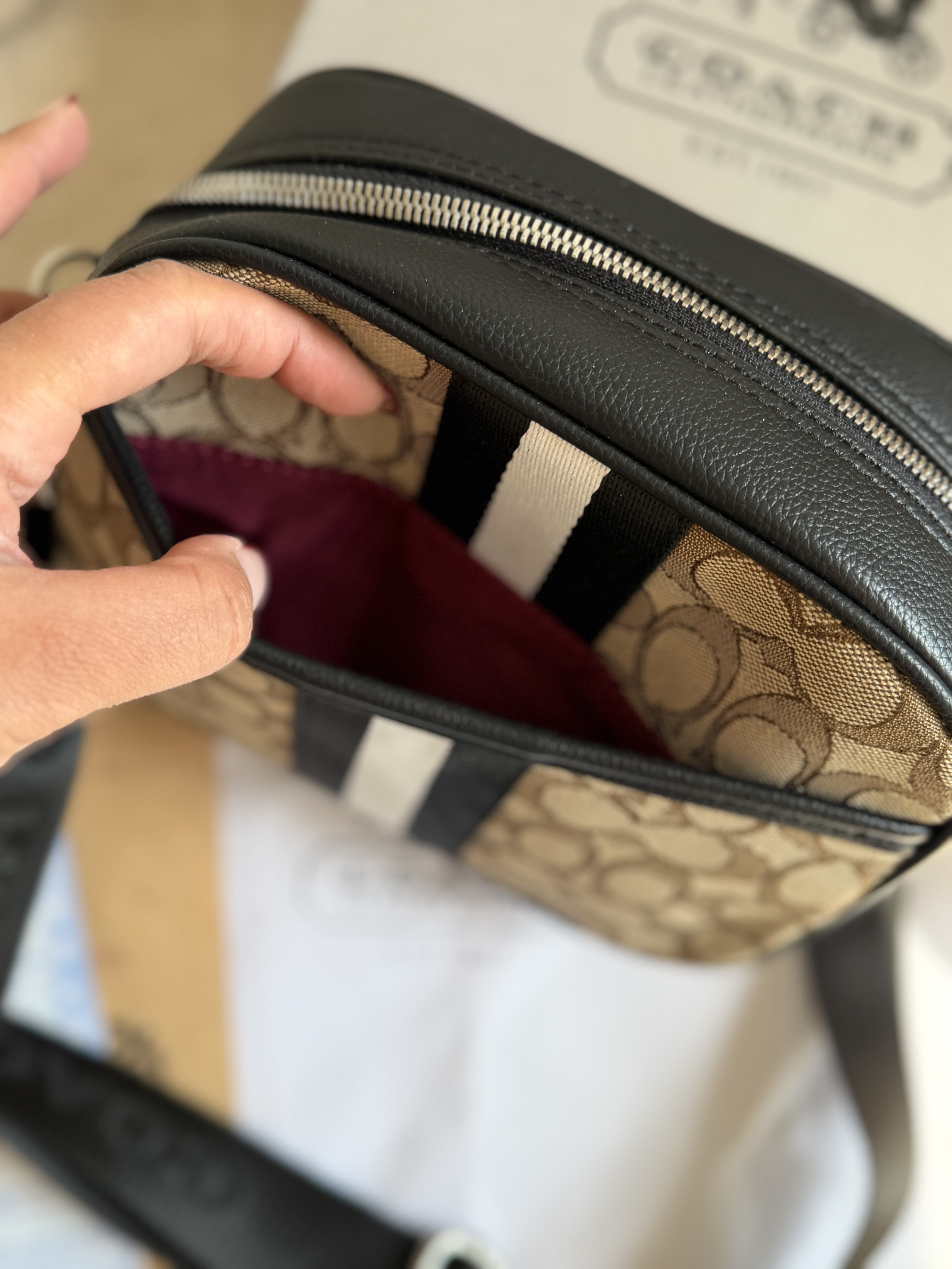 روی یراق ها و زیپ و آستر کیف برند کوچ حک شده
