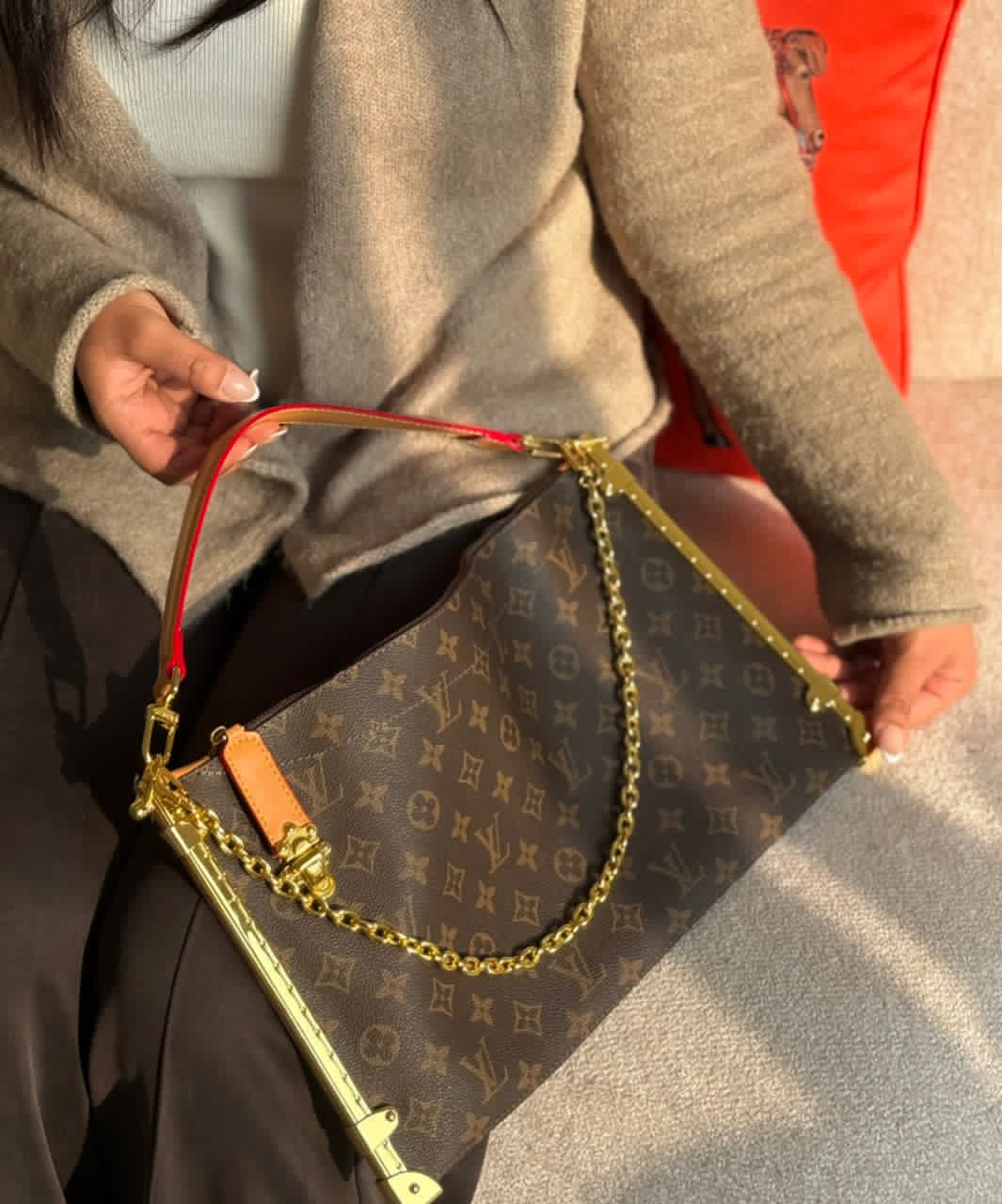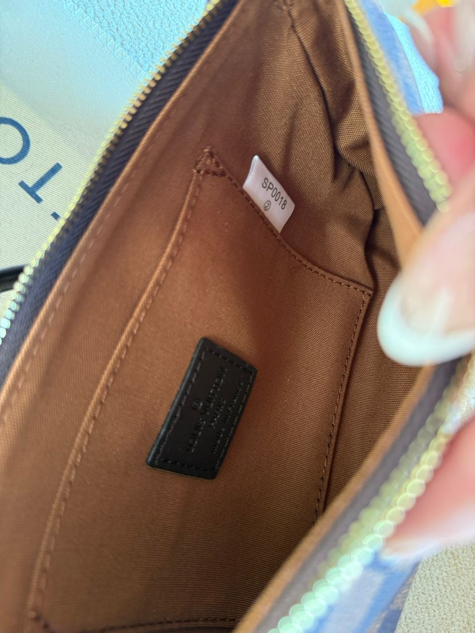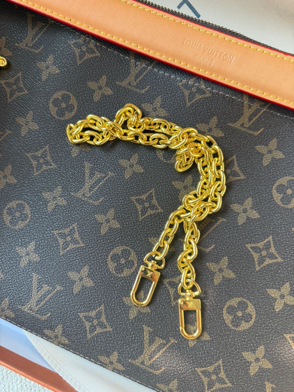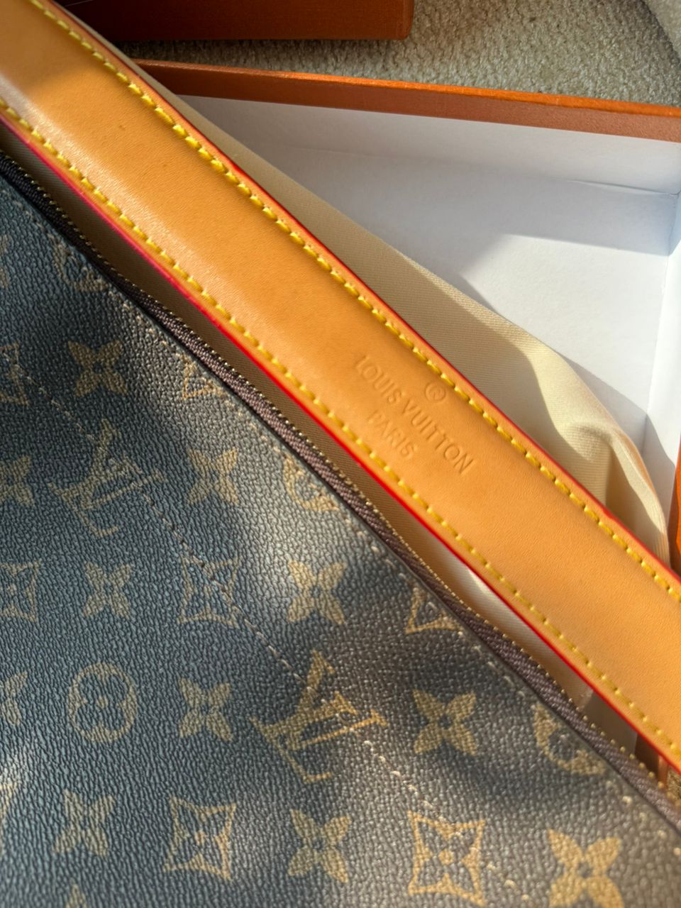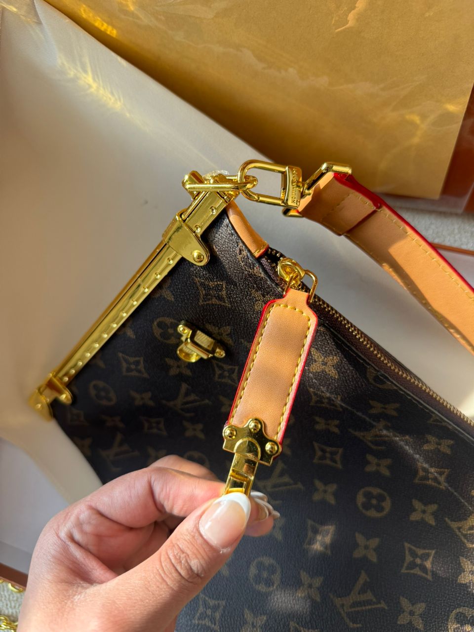 روی بند چرمی کیف برند لوییز ویتون حک شده .