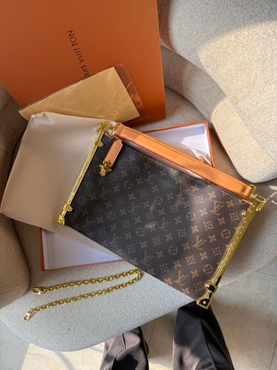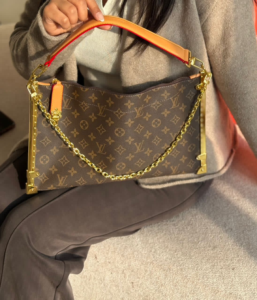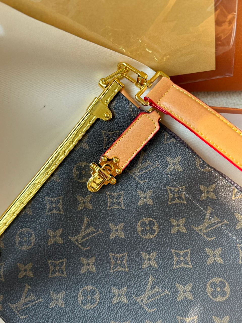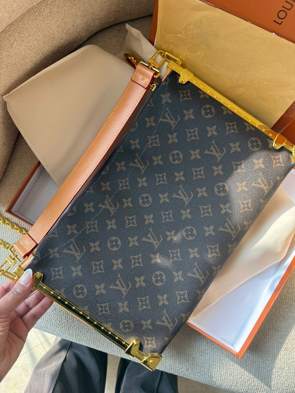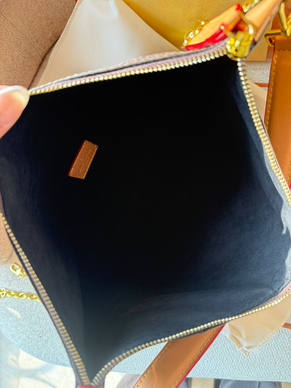 چرم طبیعی اعلا . برند لوییز ویتون روی یراق های کیف حک شده .